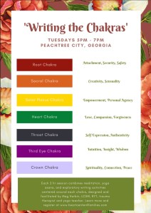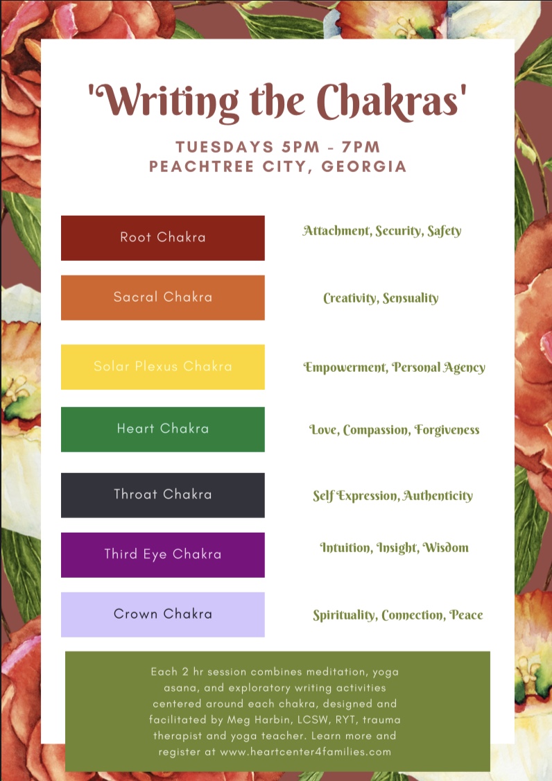 Each 2 hr session combines meditation, yoga asana, and exploratory writing activities centered around each chakra, designed and facilitated by Meghan Coyle, LCSW, RYT, trauma therapist and yoga teacher. Register by emailing Meg at meg@heartcenter4families.com